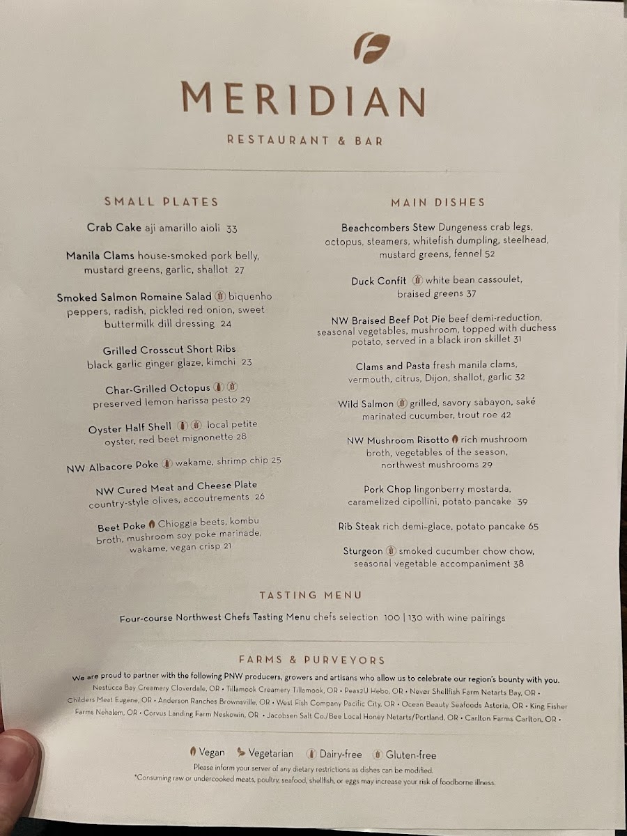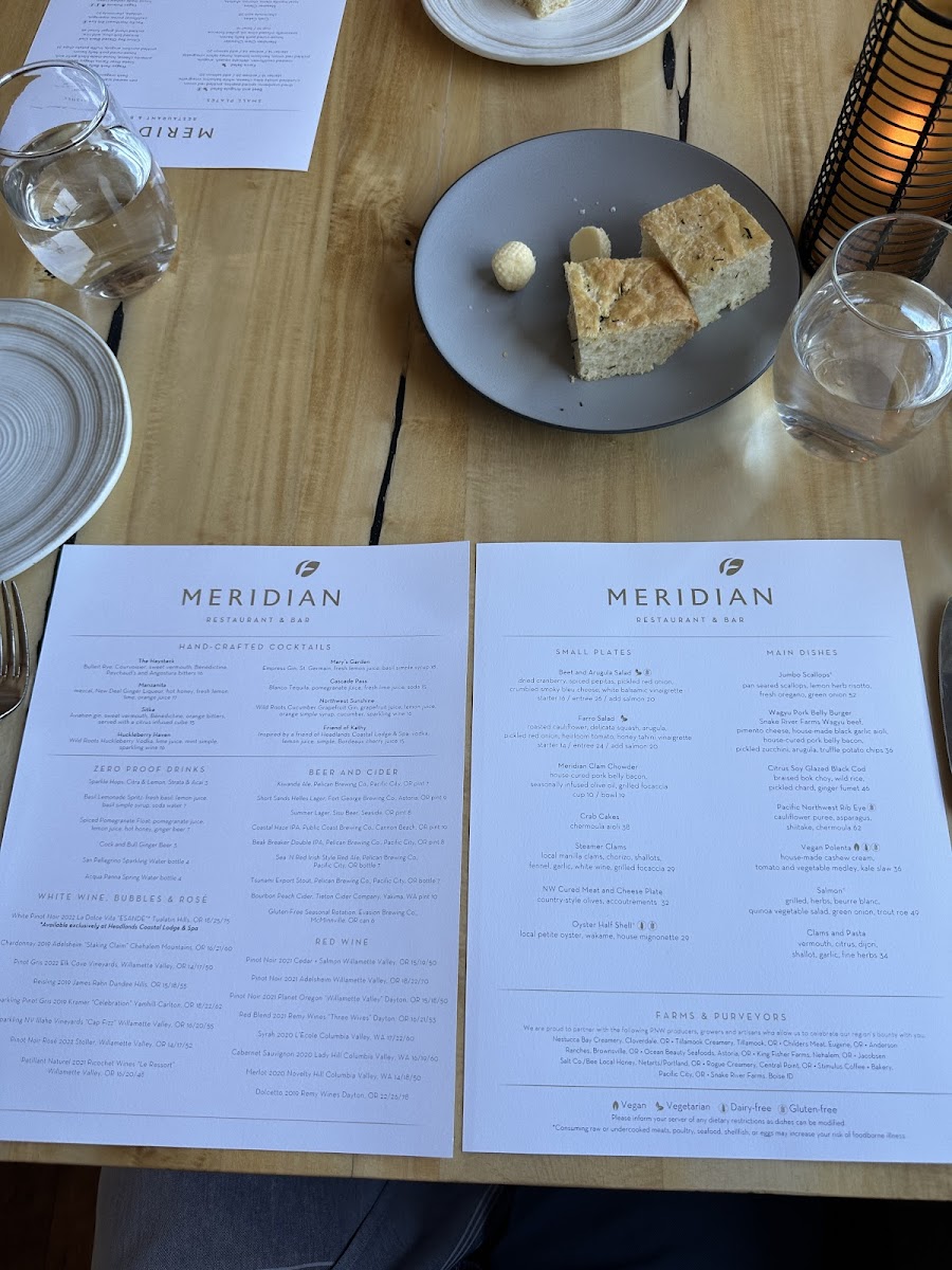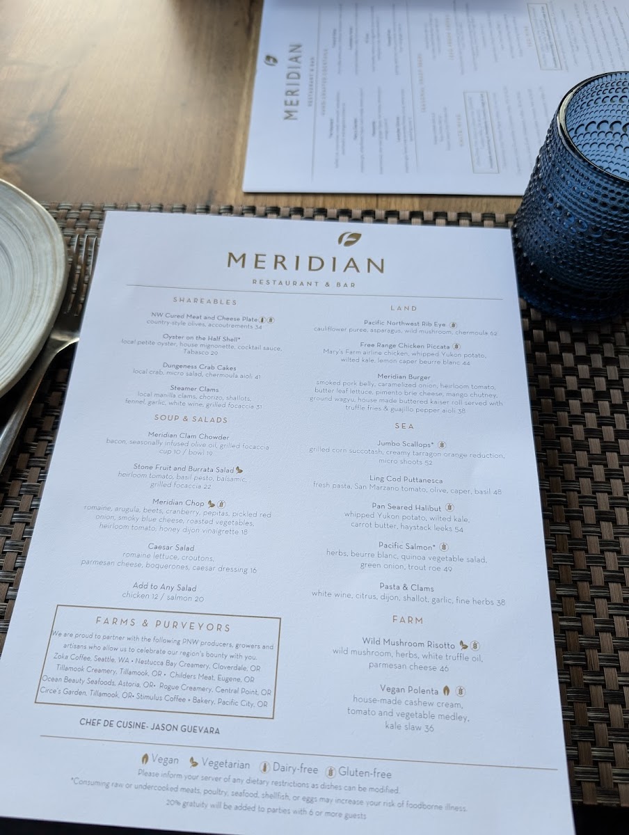 Welcome to Meridian Restaurant & Bar, nestled in the stunning locale of Pacific City, Oregon. With panoramic views and an inviting atmosphere, Meridian transcends the dining experience. The menu showcases an artful selection of local ingredients, featuring standout dishes like expertly cooked halibut, savory scallops, and an exquisite spicy lava torte that promises a delightful conclusion to any meal.